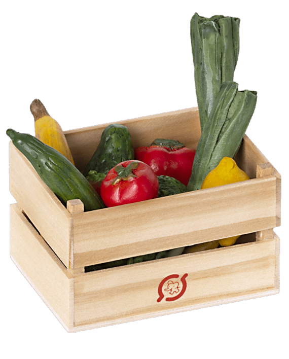 Maileg Grönsakslåda är en trälåda fylld med härliga grönsaker och solmogen frukt i miniatyrstorlek. Grönsakerna är handmålade vilket gör att färgerna kan variera. Rekommenderas att användas från 3 år.