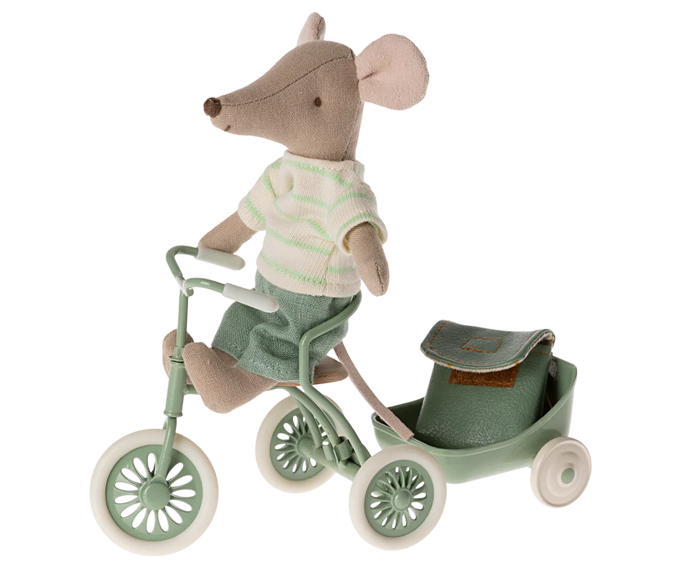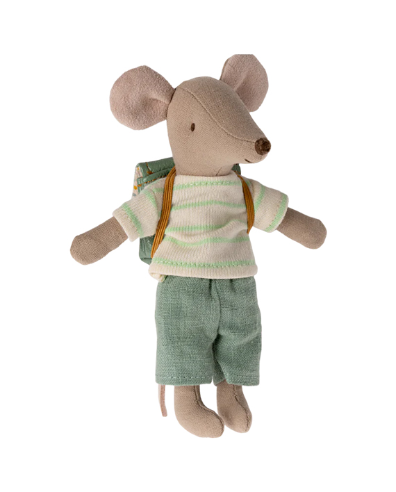 Maileg Storbror mus för trehjuling är klädd för en dag på dagis eller skola och bär sin ryggsäck på ryggen. Han har magneter i händerna så att han kan hålla i trehjulingens handtag för en snabb resa.