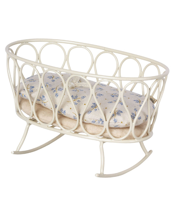 Maileg Vagga My Blå är en vackert designad vagga i metall med en mjuk sovsäck och madrass inuti. Vaggan har rundade fötter så att du enkelt kan vagga dina små vänner i sömn.