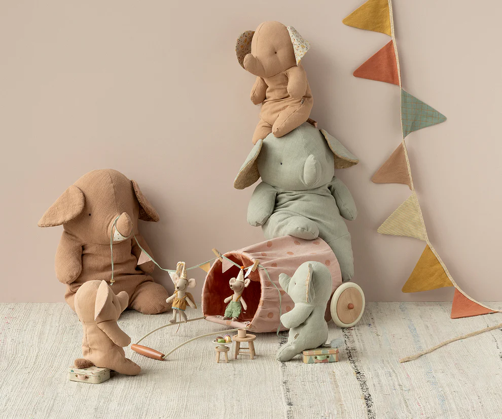 Maileg Safari Elefant Big Powder är en stor och kramgo kompis i form av en elefant från danska Maileg. Elefanten är mjukt stoppad och har små kulor i baken för extra tyngd vilket gör att den kan sitta.