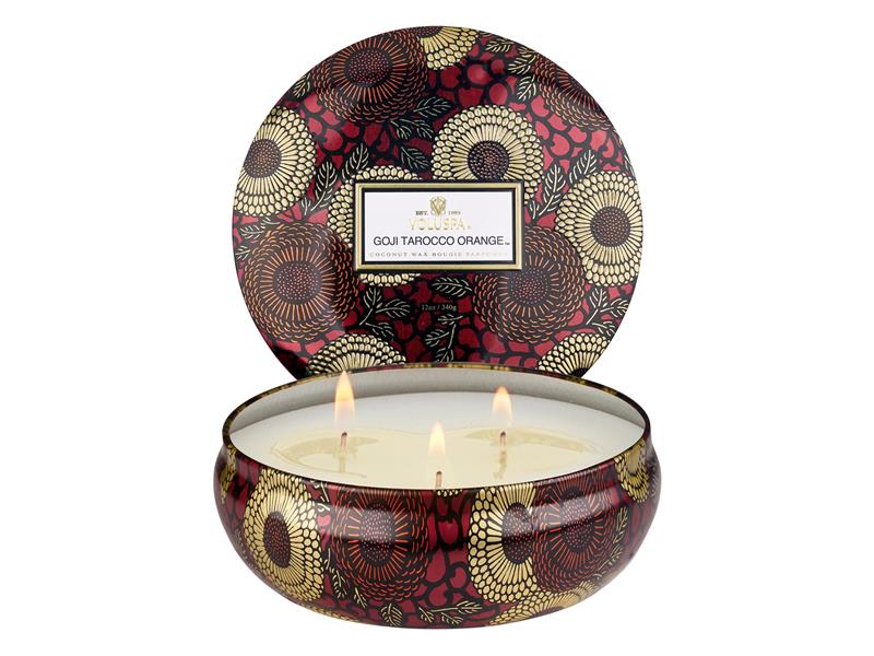 Voluspa 3-wick Tin Candle Goji Tarocco Orange är ett doftljus som har en krämig kokosvax blandning som gör att ljuset utsöndrar en mycket kraftfull och generös doft, dessutom gör kokosvaxet att ljuset brinner med en klar låga och ger doftljuset en lång brinntid. Ljuset doftar av utsökta italienska taroccoapelsiner, mogen mango och gojibär. 40h brinntid.