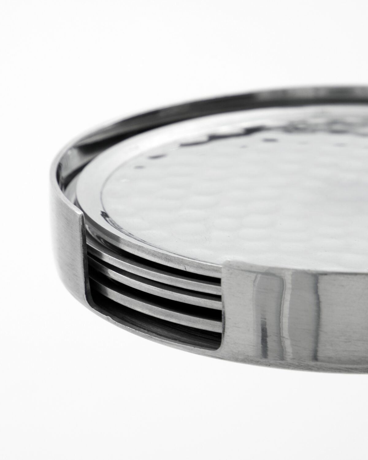 Runda former och hamrat mönster adderar karaktär och elegans till din dukning. Satsen med fem i snygg metallförvaring passar perfekt i hemmabaren, matbordet eller i vardagsrummet och lyfter känslan när du serverar dina favoritdrycker.