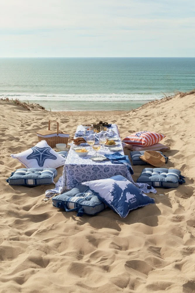 Duka i en avslappnad, kustinspirerad stil med denna snäckmönstrade bordsduk i fräscht vitt och blått. Den är tillverkad av mjuk, slitstark ekologisk bomull och ger enkel elegans till vardagsmiddagar och sommarens sammankomster, medan den broderade kanten och den vävda logoetiketten ger en polerad finish. Matcha med den tillhörande servetten för ett enhetligt uttryck.