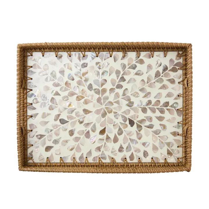 Den eleganta SUNNY brickan i grönt och natur är ett konstverk i sig. Mönstret på brickans yta är skapat av odlade snäckor, vilket ger en taktil och naturnära känsla. Kanten är i flätad rotting, vilket förstärker det rustika uttrycket. Använd den för att servera drycker, ordna en vacker fika eller som en stilfull detalj i inredningen. En handgjord och hållbar design som kombinerar funktion med estetik.