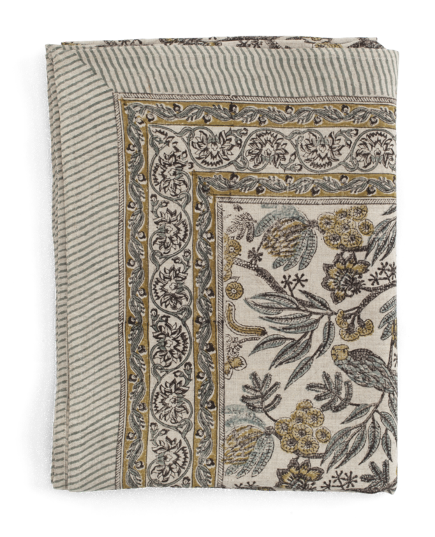 är handtryckt enligt traditionell blockteknik i Indien. Mönstret är böljande vackert och tidlöst. Linnet i denna duk är lite tätare vävt och ger ett finare intryck. Denna duk passar lika fint på högtidsbordet som i vardagen. Duken är gjord av 100% linne och tvättas i 30 grader med liknande färger på skonprogram