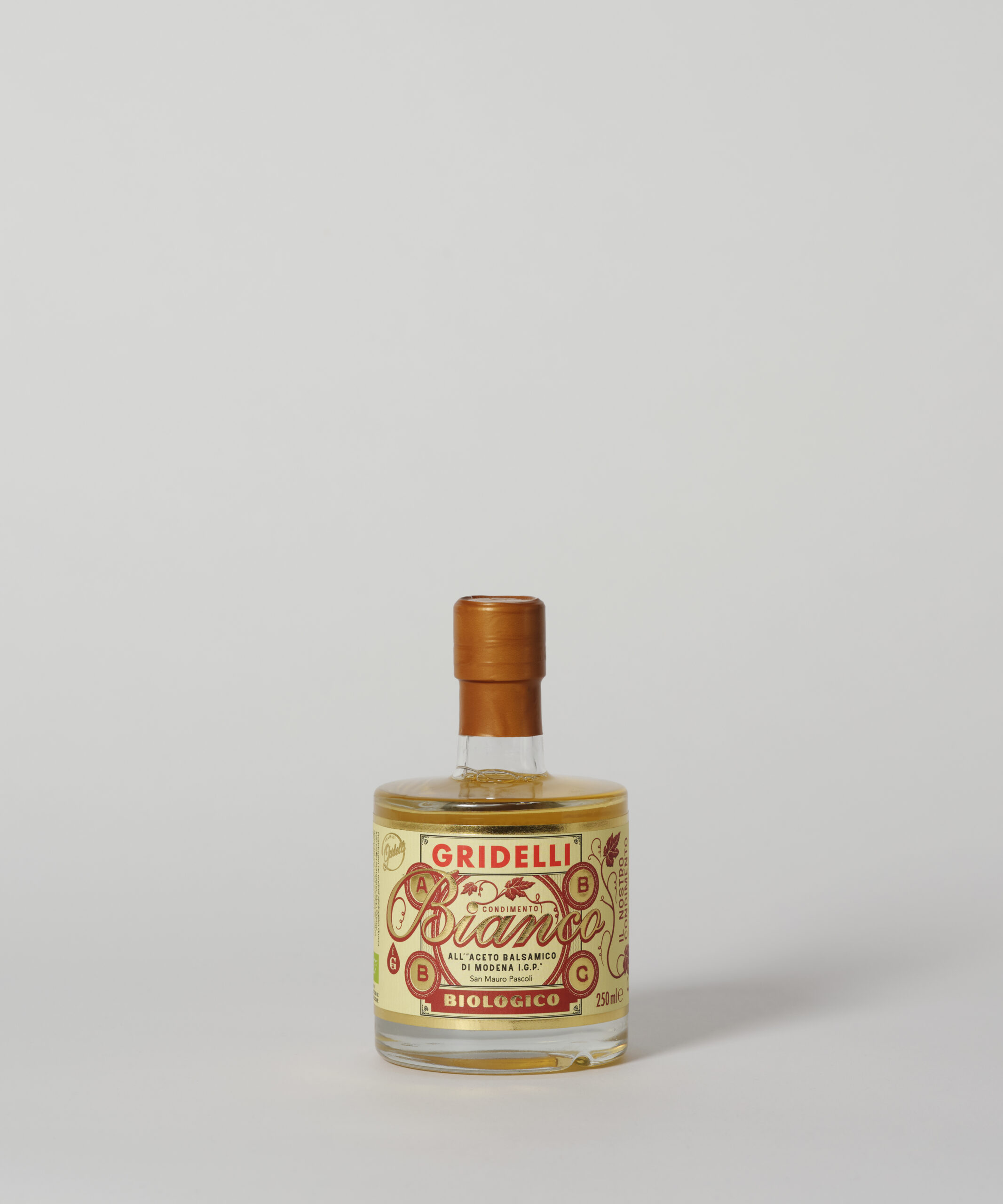 Gridelli Balsamico Bianco är en ekologisk Balsamico från Gridelli. Balsamicon kommer från Modena, Italien, där den tillverkats på trebbianodruvor. Druvmust och vitvinsvinäger förenas för att få fram den perfekta blandningen av syra och sötma. Innehåller inga färgämnen eller övriga tillsatser. Passar fint med sallad, lagrad ost, grillat kött eller med vaniljglass och färska bär.