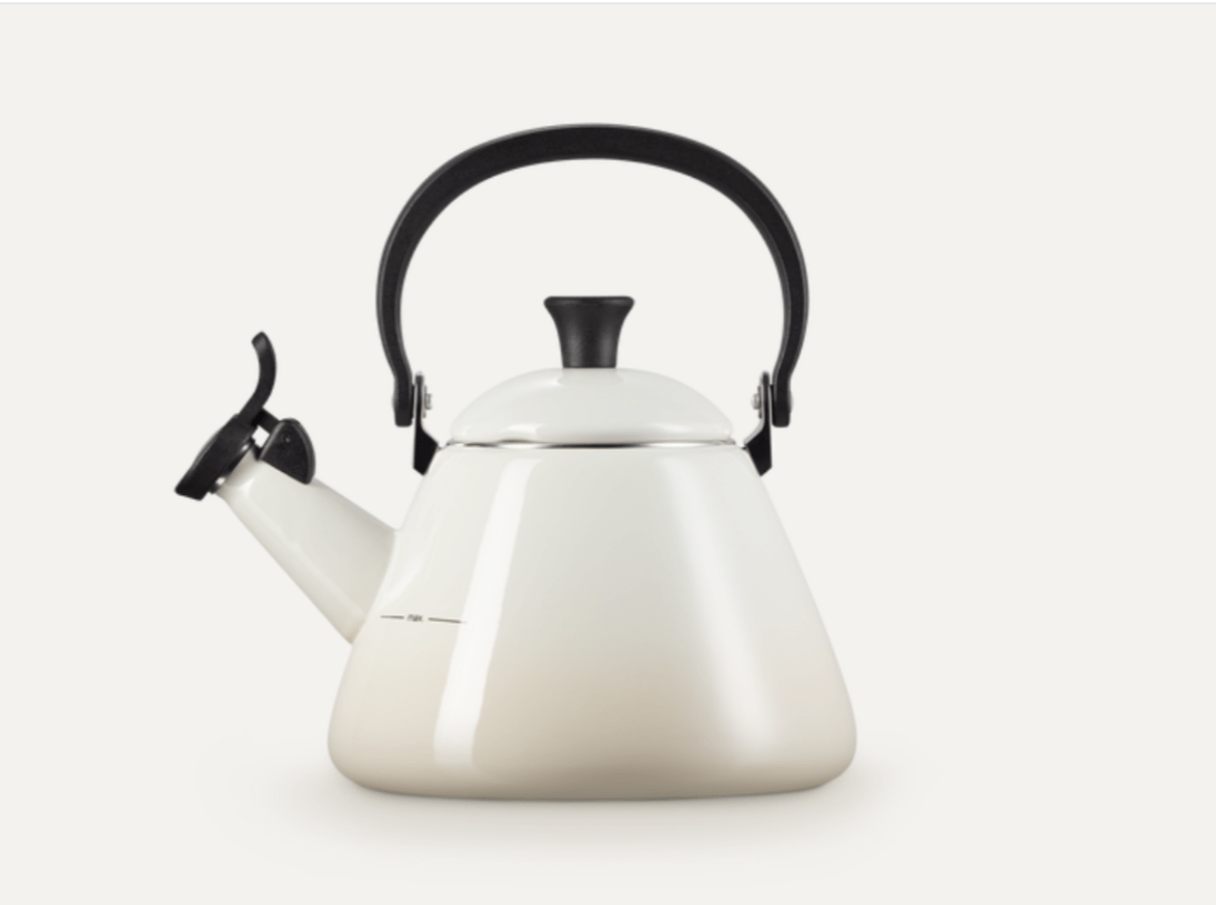 Le Creuset Vattenkittel Kone 1.6L Meringue med vissla är en klassisk, emaljerad stålkittel som kan användas på alla värmekällor inklusive induktion. Vattenkitteln har en stor botten som ger bra kontakt med värmekällan vilket ger en effektiv uppvärmning av vattnet. Vid användning på induktionshäll är den sladdlösa vattenkitteln faktiskt lika effektiv som en elektrisk vattenkokare. Vattenkitteln Kone har ett värmebeständigt handtag och en fast vissla som är lätt att öppna när vattnet ska hällas upp. Vattenkitteln rymmer 1,6 l vatten och den maximala vattenkapaciteten är markerad på sidan av kitteln för att undvika överkokning.