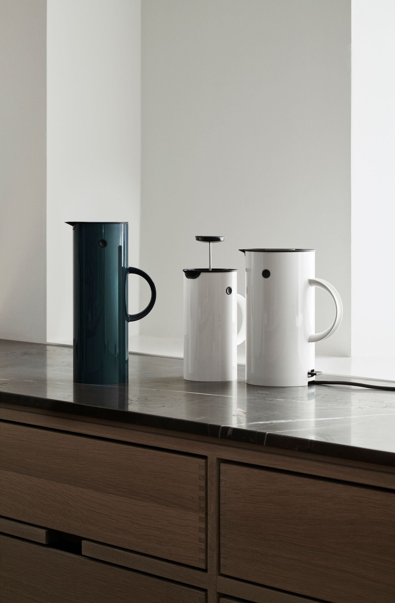 Den klassiska termoskannan EM77 av Erik Magnussen har prytt kaffebordet världen runt i över 40 år, och nu introduceras en helt ny medlem av EM-familjen: EM77 vattenkokare, som ger köket ett stilrent uttryck och funktionellt kompletterar EM77 kaffepress och EM77 presskanna te. EM77 vattenkokare har en hög prestanda som gör att vattnet kokar snabbt upp med låg energiförbrukning. Den trådlösa vattenkokaren rymmer 1,5 l och är försedd med ett avtagbart kalkfilter, den är säkrad mot torrkokning och slår av automatiskt när vattnet har kokat klart.