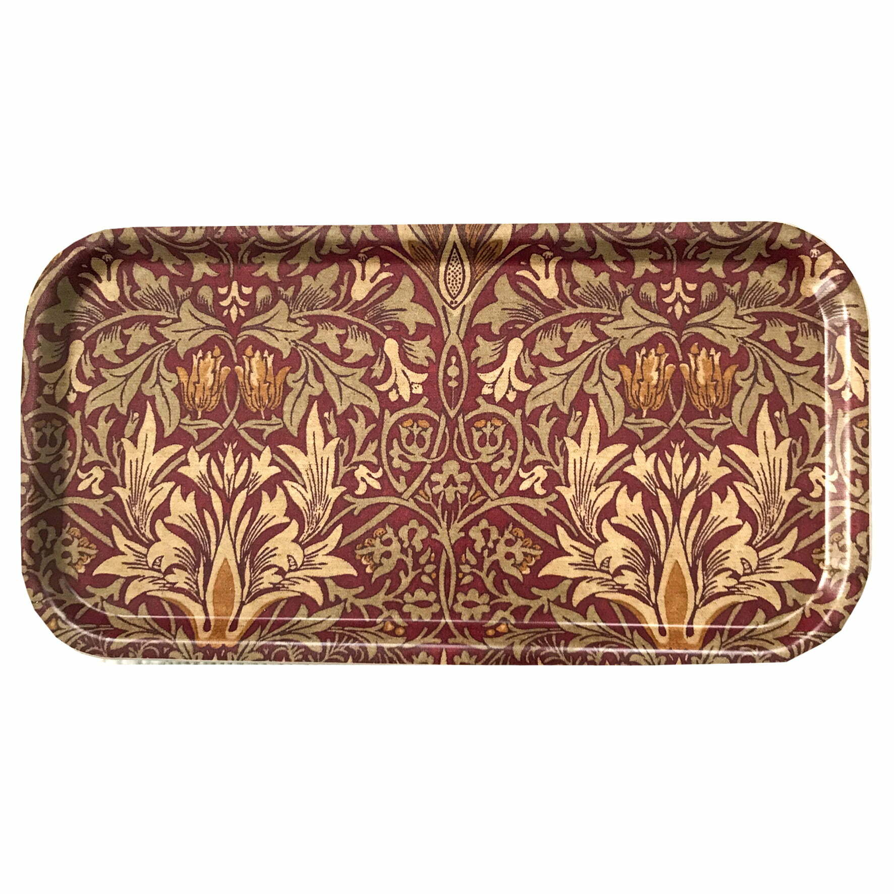 Morris Cocktailbricka Snakeshead Röd har ett klassiskt tyg från engelska William Morris som möter ett svenskt hantverk i brickan som är gjord i Sverige. Tyget ger ytan en tydlig textil struktur och varje produkt blir unik eftersom mönstrets placering varierar. Brickan består av flera lager björkfanér, tyg och melamin vilka läggs samman för hand och pressas samman under hög värme och tryck. Melaminet gör ytan extra tålig att man till och med kan diska brickan i diskmaskin.